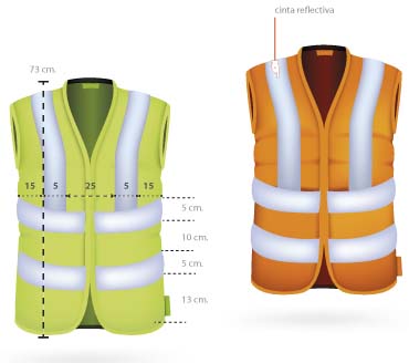 Chaleco confeccionado con tela aireada 100% Polyester fluo y un aplicado de dos cintas reflectivas que corren perpendicularmente por la prenda de 50 m/m cada una y dos cintas que corren verticalmente. Ambas cintas reflectivas cuentan con 500 candelas lux.